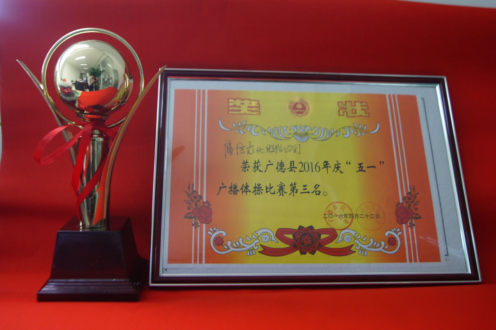 2016年4月22日上午,安徽廣信農(nóng)化股份有限公司廣播操代表隊(duì)在2016年廣德縣慶“五一”廣播體操比賽中從33支代表隊(duì)中脫穎而出,獲得了全縣第三名。此次比賽廣信股份代表隊(duì)是唯一一個(gè)企業(yè)代表隊(duì),比賽中無(wú)論是服裝、隊(duì)形、入場(chǎng)、退場(chǎng),還是音樂(lè)剪輯、隊(duì)伍的口號(hào)、做操的整齊度以及精神面貌等等都得到了其他代表隊(duì)的嘖嘖稱(chēng)贊,充分展現(xiàn)了廣信員工的青春活力和積極向上的團(tuán)隊(duì)作風(fēng)。